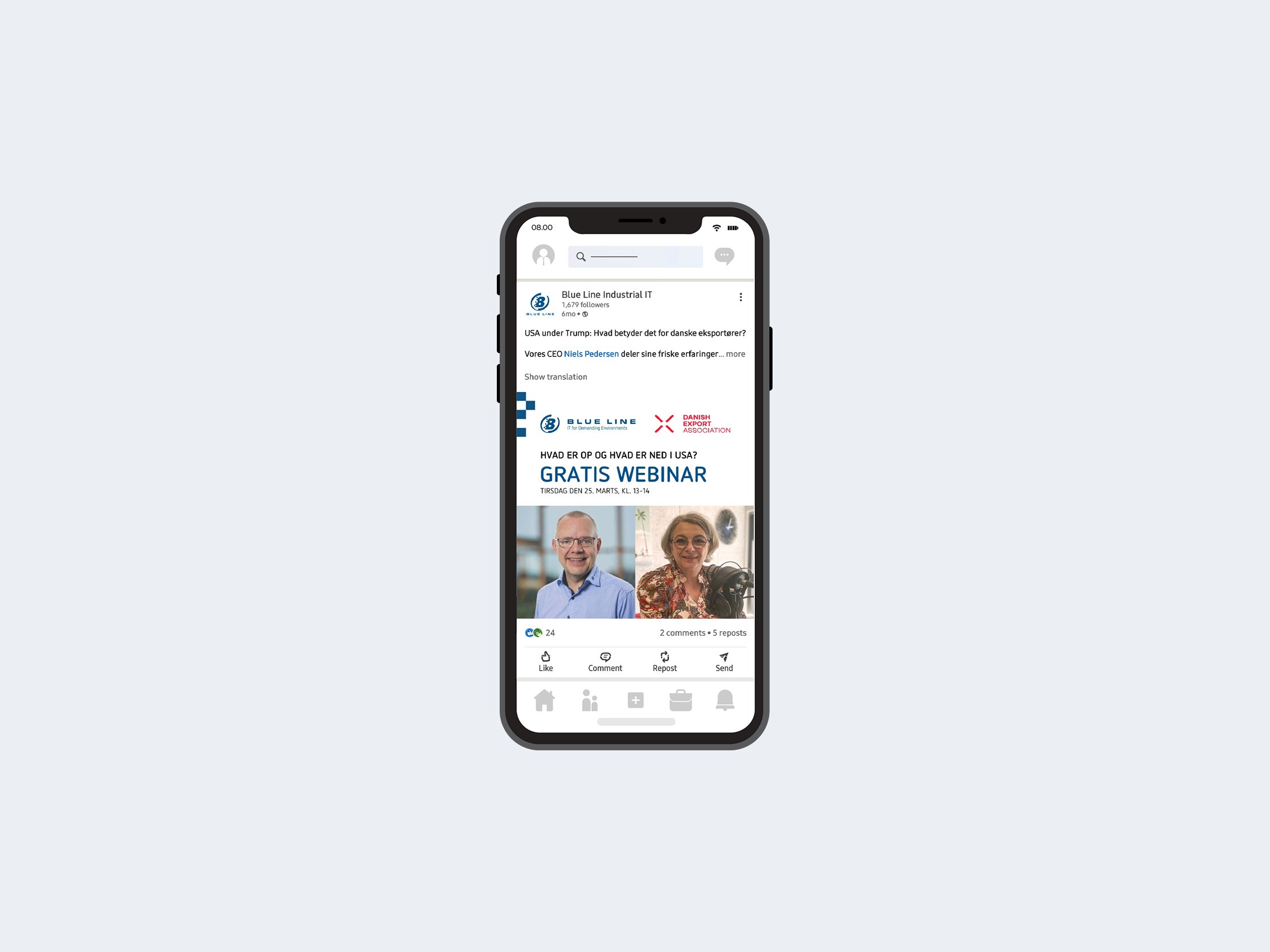 B2B-markedsføring på LinkedIn for Blue Line A/S. Jeg stod for at skrive engagerende opslag og producere grafisk indhold til virksomhedens LinkedIn-profil – med fokus på at formidle tekniske IT-hardwareløsninger til beslutningstagere inden for industri, forsvar og pharma.